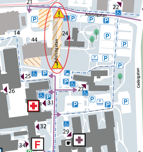 Se vilka vägar och parkeringar som är påverkade av ombyggnationer på sjukhusområdet i Västerås.